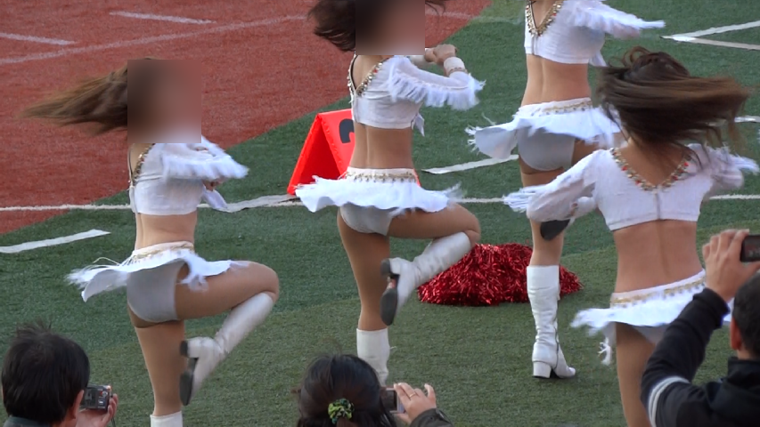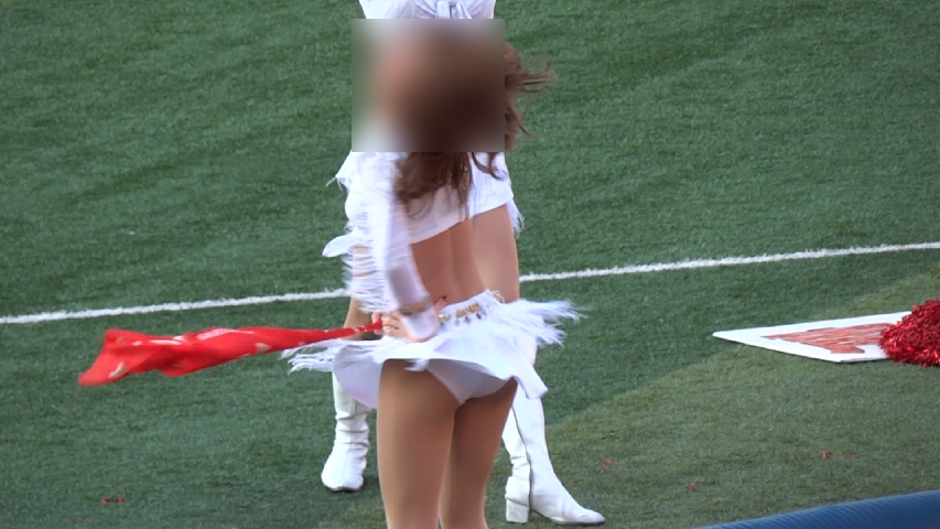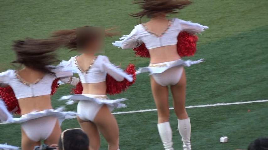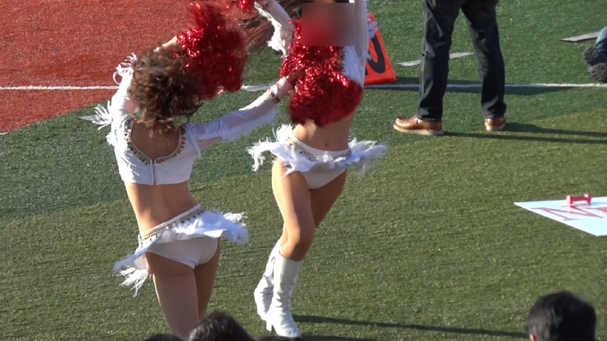 社会人アメ〇トチアリーダーのサイドライン応援とハーフタイムショーでの演技です。