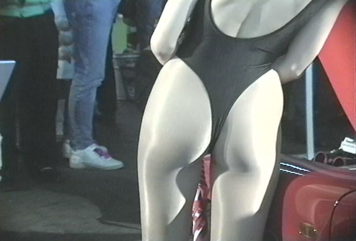 9分収録の某プリンターメーカースポンサードレーシングチームの発表会では、青のハイレグワンピースのサーキットレディが登場!