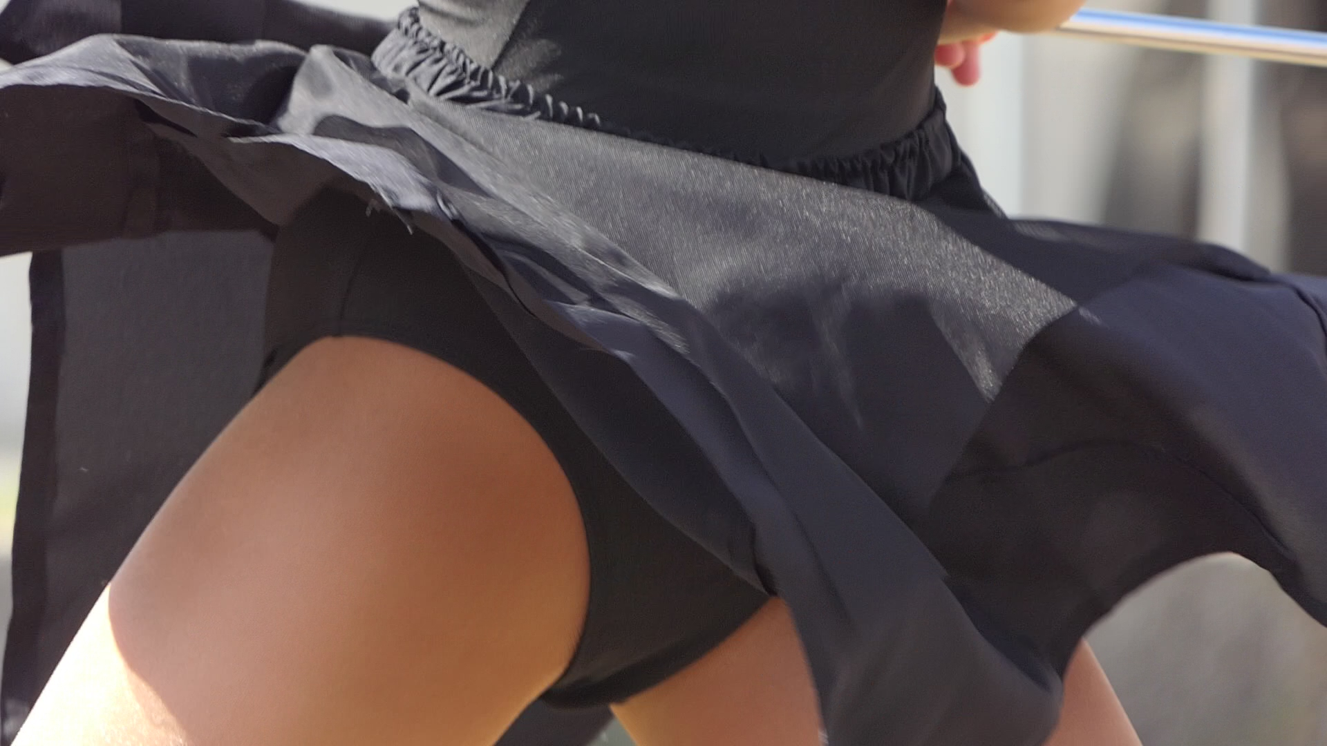 冒頭はバトンの一人パフォーマンス。黒、青のレオタード姿。