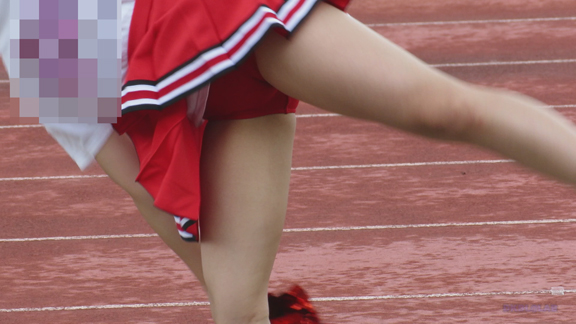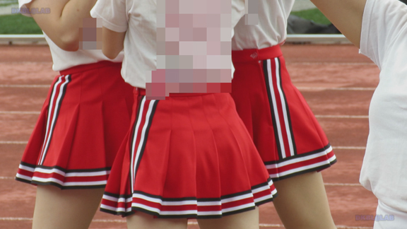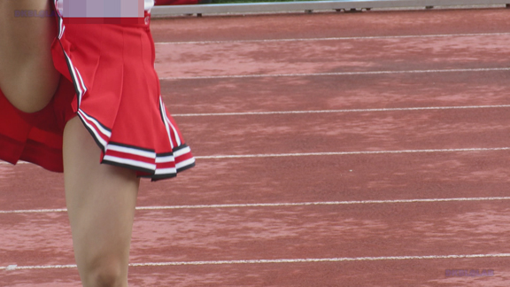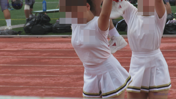 グラウンドの端のほうにチア娘が集まった応援の様子、赤地に白黒のラインが入るユニ。