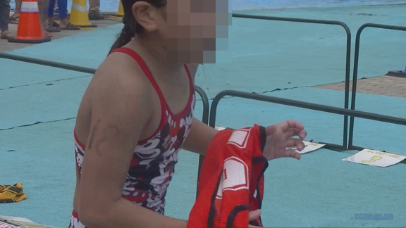 Ⅴキョウスイのままプールサイドに立ち映像記録しているシーンが健けなげ。