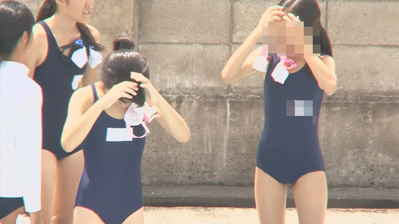 泳ぎの順番待ちのシーンでは濡れ濡れ水着から水滴をぽたぽた落としながら自分の番を待つ娘の姿。寒いのか時々体を動かしています。
