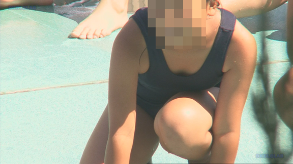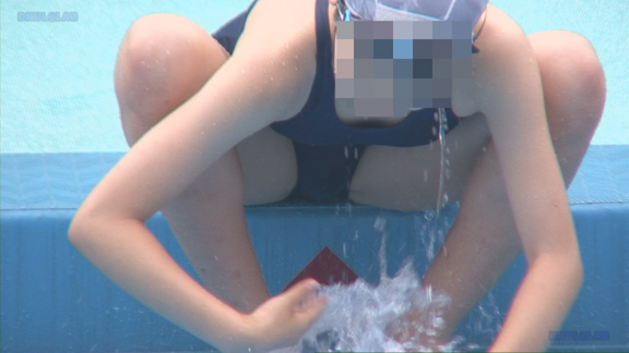 陽光にぴったり張り付く水着は丈の長さに関係なく魅力的!このチームでは少数派の赤タグ水着娘のプールサイドで見せる笑顔がステキ。