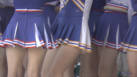 青・白地に黄ラインユニに青のVアンダーのチア娘の応援近接シーンから!