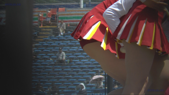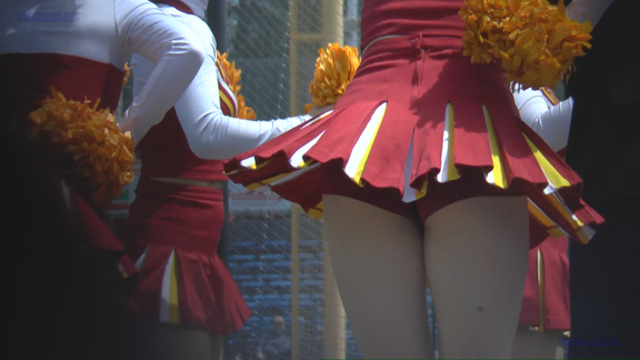 赤・白のタイトユニのチアチームの応援シーンが12分ごろまで。続いては青上、白地に赤・青のアクセントスコートのユニチアチームの応援シーンへ!