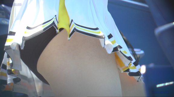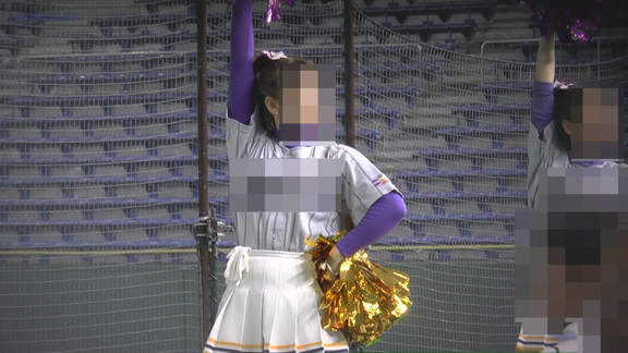 上グレー・白地に紫・黄ラインスコートのチアユニ娘の近接シーンから!