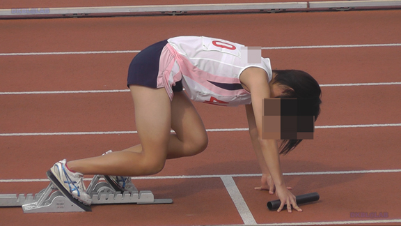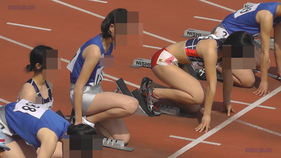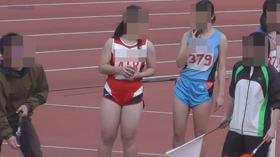 スタートブロック付近の出走前の紺・赤Vユニ娘や銀スパ娘のラインをじっくしと!着こなしチェックシーンに目が離せません!