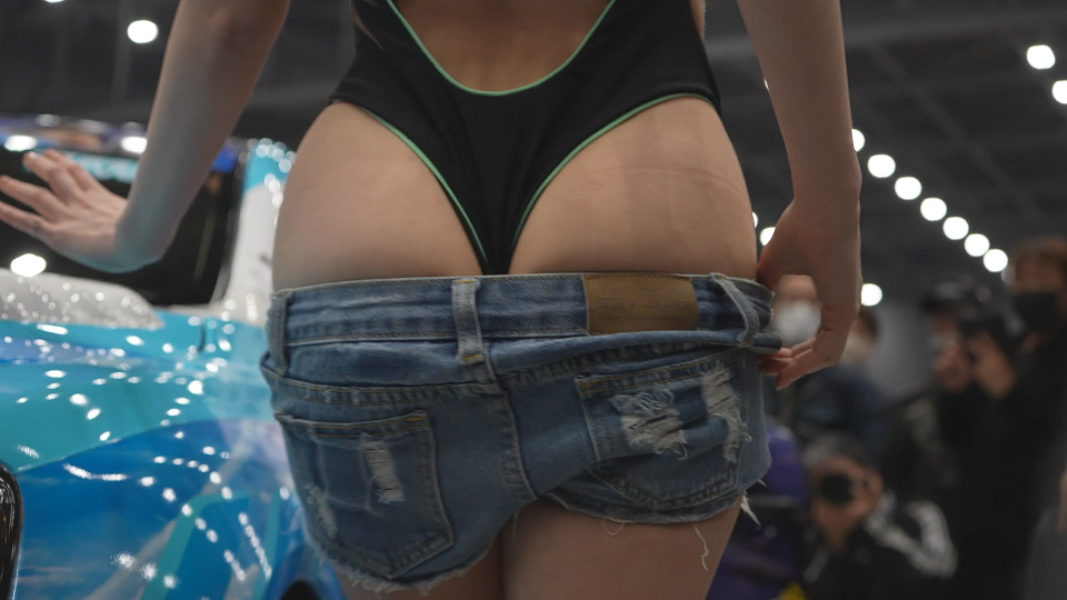 最後はデニムショートパンツからTバック尻がはみ出るどころか丸出しでした。きれいな丸いお尻がっくきり。こちらも見事でした。