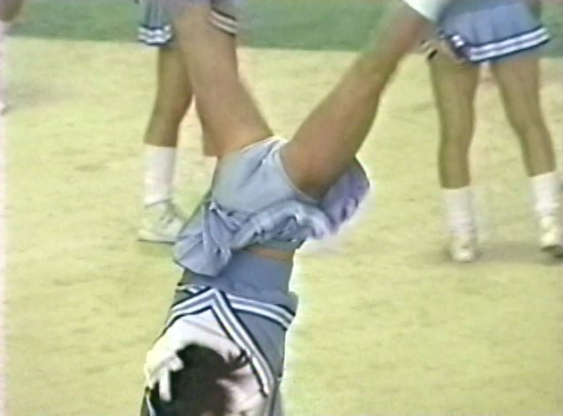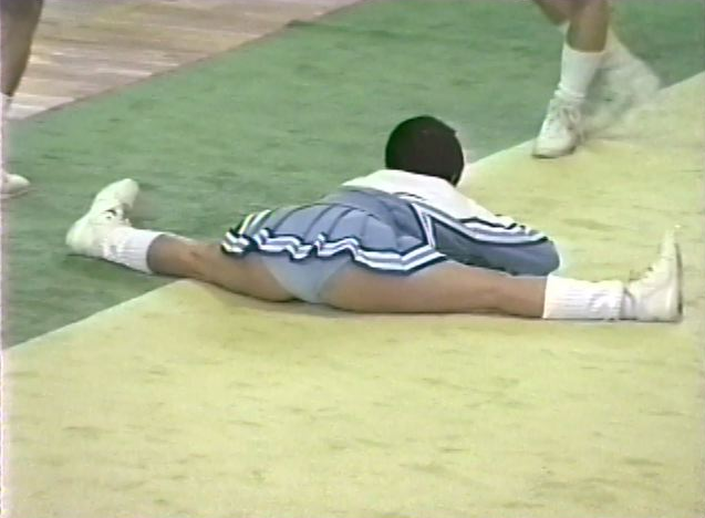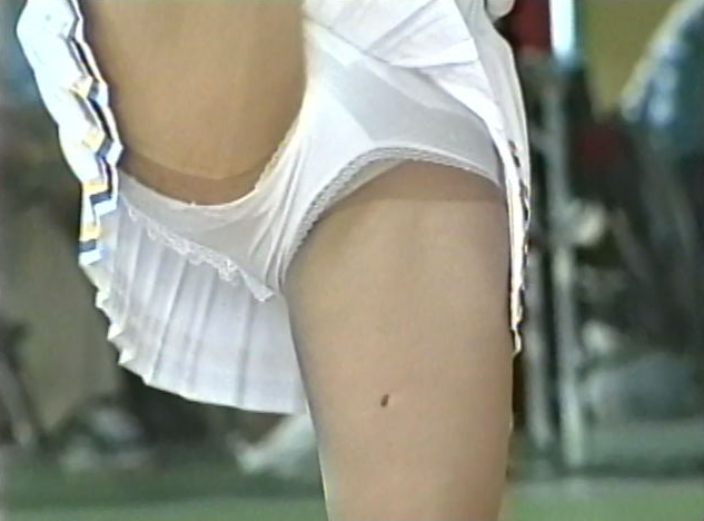 最初の団体はセーターにプリーツスカートのチアチームとスカート付きレオタードのチームが登場。キック、ターンと見事に舞い上がっています。