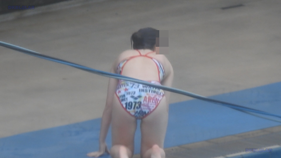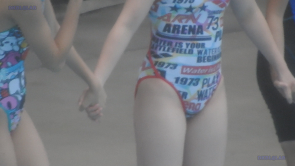 練習が終わりほっとしたシーン、スイムキャップを外し皆横一列になり一斉に水の中へドボン!幾度ともなく繰り返し、ほっこりシーンもご覧いただけます!