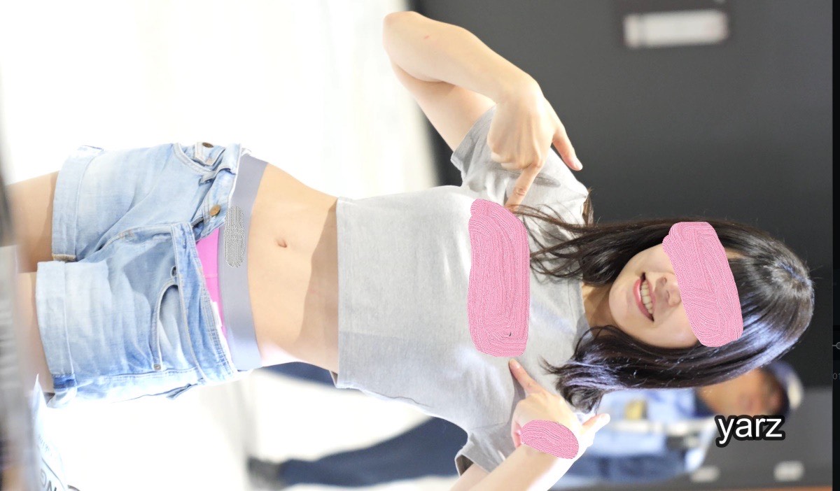 笑顔でにっこり撮影対応。しかしデニムのショーパンのチャック下して