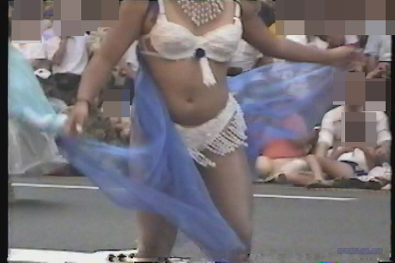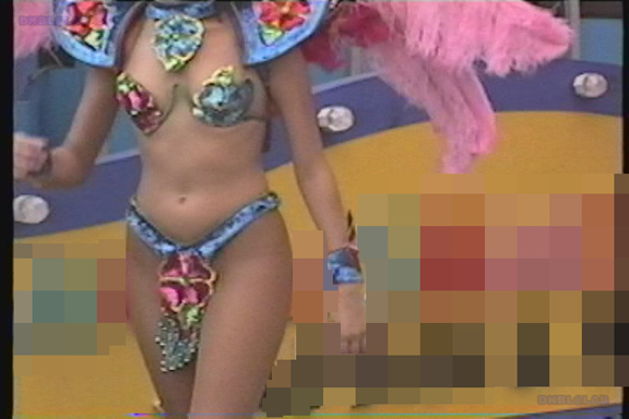 気合の入ったサンバ衣装の娘からタンクトップにスパッツという軽装の娘まで各々がパフォーマンスをエンジョイしております!画面下部にアナログ独特のノイズが入っておりますが、熱いサンバ行進をお届けしたくそのまま収録しております。