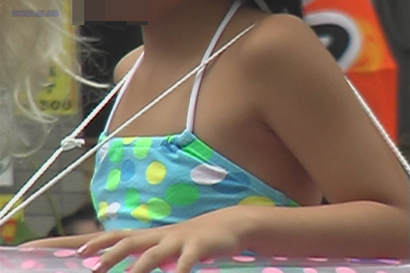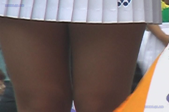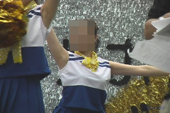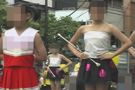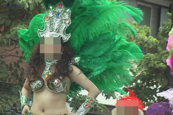 本格的なサンバ衣装娘のパフォーマンスのち、4分ごろより上緑Tシャツ・下白プリーツミニスカートの鼓笛隊が登場!白ハイソックスの眩しいビギナーさん達の登場で胸は高鳴ります!
