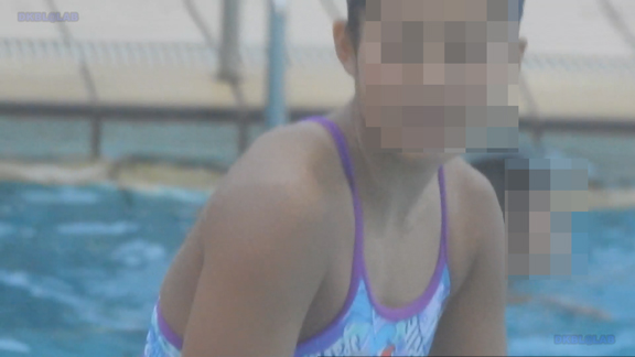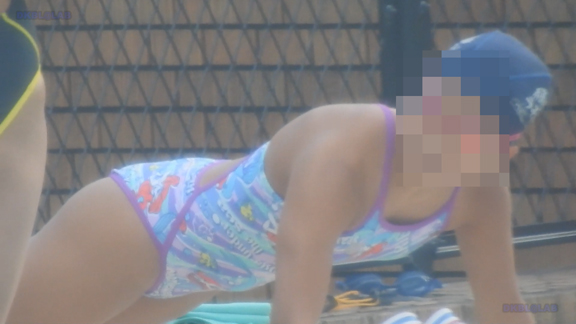 様々なV型キョウスイに身を包んだ娘たちが集まって参ります!髪をスイムキャップにIN!腕立てなど準備運動をするキョウスイ娘!