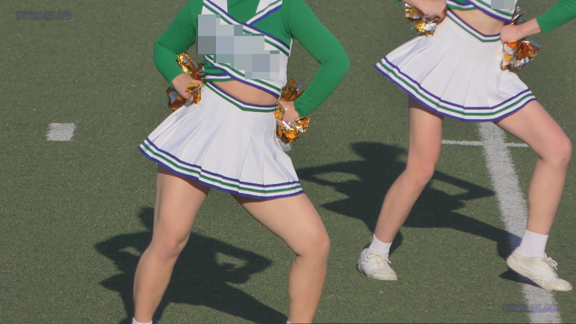 続いて土砂降りの雨の中、白・緑チアユニ娘の応援シーンへ!ずぶ濡れのチア衣装、そしてハイキックも連発!緑Vアンダーがコンニチワ!すごい状況になっております!