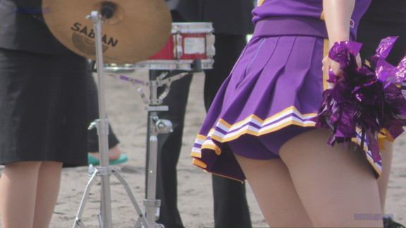 砂浜での紫・白チアユニ娘の平場応援演技シーンからスタートです!ハイキックシーンでは紫アンダーがコンニチワ!